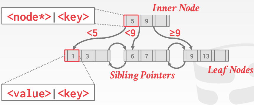 总而言之,一个完整的 B+ 树由根节点、内部节点、叶子节点三部分组成。每个节点均有键(key)和值(value)组成,区别在于内部节点的值指向子节点的指针(通常是页 ID,用于导航到下一层节点),而叶节点的值指向实际数据记录的引用(通常是 RID,用于定位存储在磁盘上的完整元组)。每个节点通常对应数据库缓冲池中的一个物理页面,通过唯一的页 ID标识。