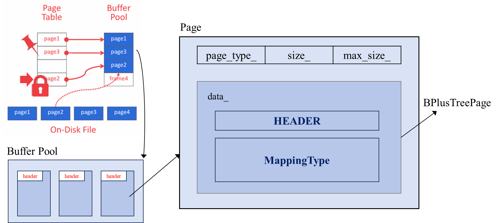 此外,尽管这里 B+ 树的所有节点均以 B+Tree Page 的形式存在,但和 lab1 的 Page 是有本质上的区别,BPlusTreePage 实际对应BPM 中 Page 对象的 data_ 存储区域。因此在读取或写入节点时,首先需要通过 BPM.CheckedReadPage(page_id) 获取受保护可读的 std::optional<ReadPageGuard> 对象(获取可写对象也如此),再将其 data_ 部分 reinterpret_cast 为 BPlusTreePage,最后根据对应的 page_type_ 强转为 Internal/Leaf page,然后在读取或写入后取消固定该页面。具体数据排布如下图所示: